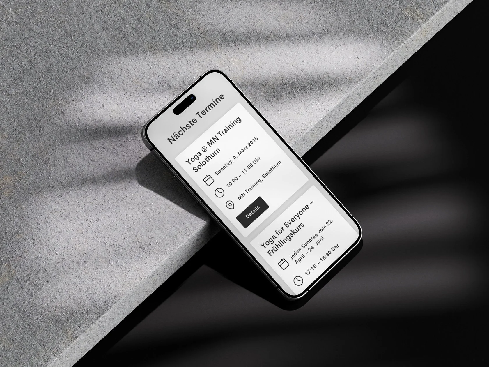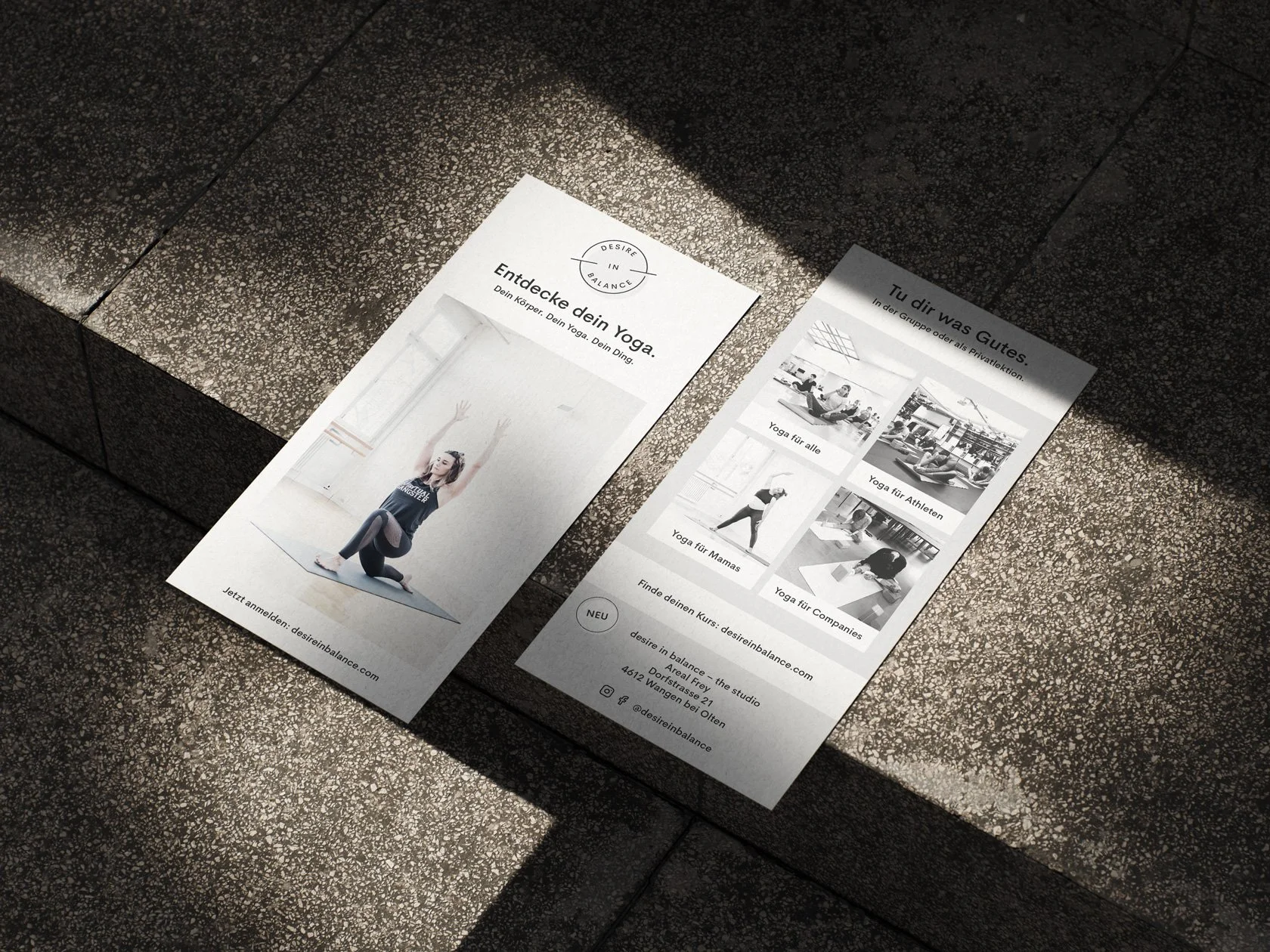 Im Zentrum steht ein prägnantes Logo aus klaren geometrischen Formen. Ein Kreis und Linien greifen das Thema Balance auf, während eine bewusste Neigung dem Zeichen Dynamik verleiht und klassische Yoga-Klischees vermeidet. Viel Weissraum, eine reduzierte Farbpalette und eine klare Typografie prägen den gesamten Auftritt – von Printmassnahmen bis zur Website – und werden durch eine ruhige Bildwelt ergänzt.